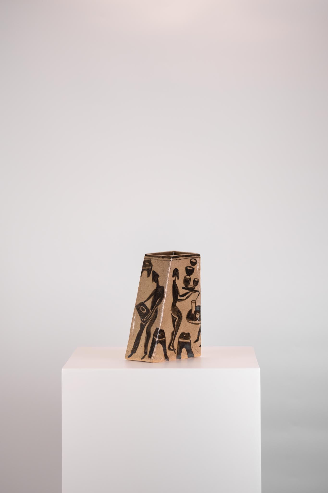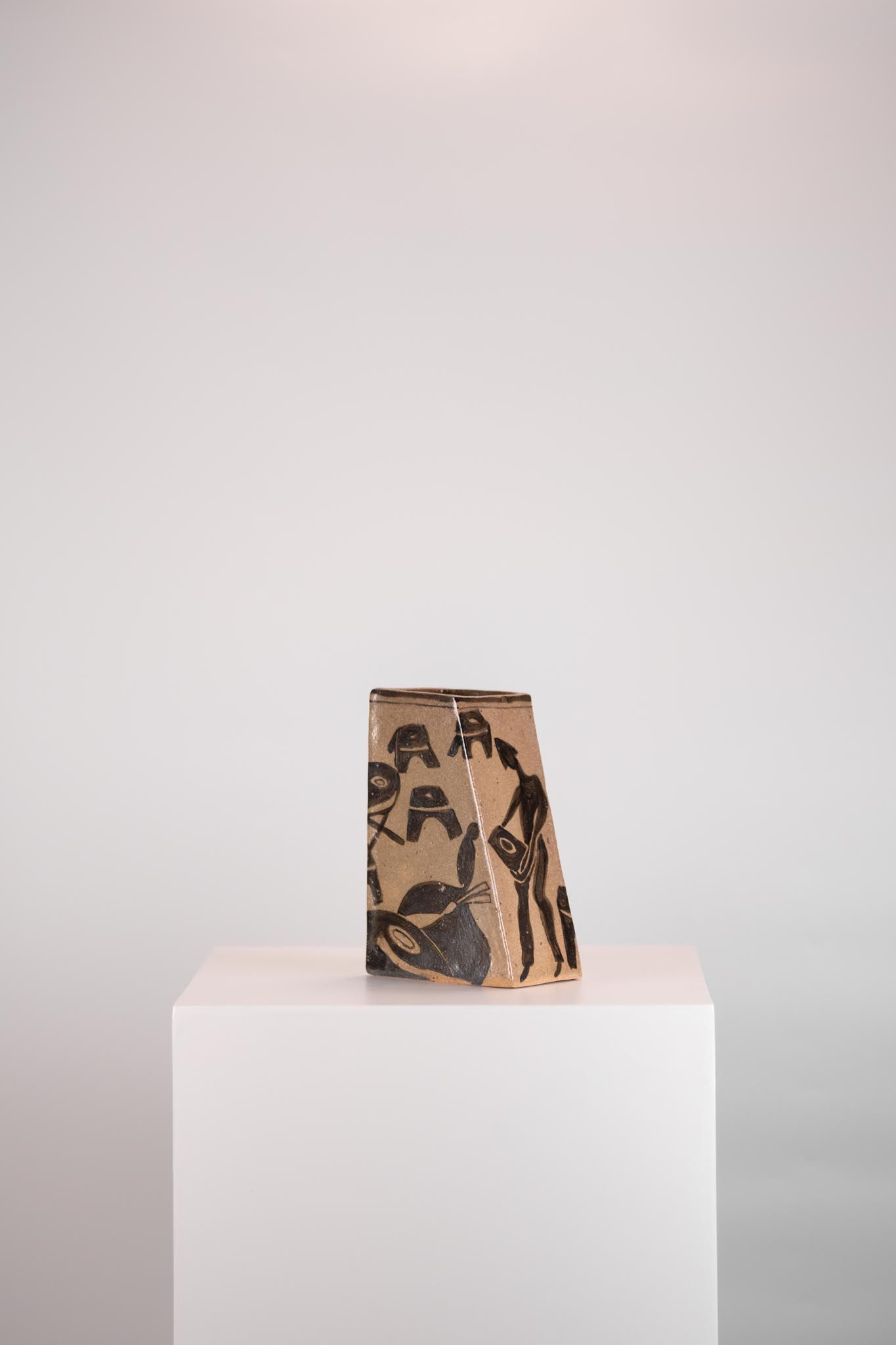 The vase was constructed using the slab technique, with individual clay panels joined and refined by hand. Black underglaze was painted directly onto the clay surface before a transparent glaze was applied, fixing the imagery while preserving the warmth and texture of the clay body.