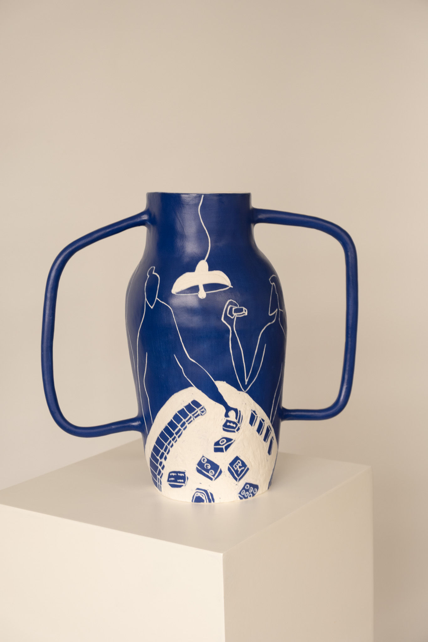 The vase was constructed using the coiling technique, with blue underglaze applied to the soft ceramic surface. The Mah Jong scene was carefully carved into the ceramic, using contrasting textures to bring the detailed illustration to life.